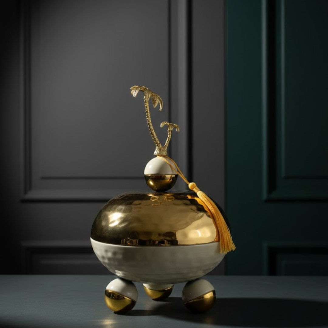 تمرية رمضاني بتصميم أنيق يجمع بين الطابع الشرقي ولمسة عصرية، مثالية لتقديم التمر والحلويات في رمضان والعزومات الخاصة. تضيف شكل راقي ومميز لسفرة الإفطار والسحور، وتكمل أجواء الشهر الكريم بذوق وفخامة.