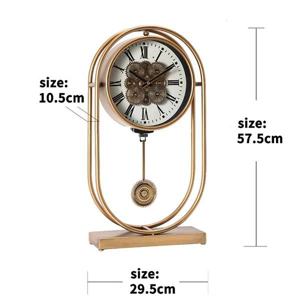 ساعة مكتب بتصميم صناعي عتيق، تتميز بقرص دائري مع تروس مكشوفة وأرقام رومانية. إطارها المعدني باللون الذهبي يضيف لمسة من الأناقة، بينما يتدلى منها بندول على شكل ترس. ترتكز الساعة على قاعدة مستطيلة صلبة، مما يجعلها قطعة ديكور مميزة للمكتب أو الرف. الأبعاد الموضحة في الصورة هي: الارتفاع 57.5 سم، العرض 29.5 سم، وقطر القرص 10.5 سم