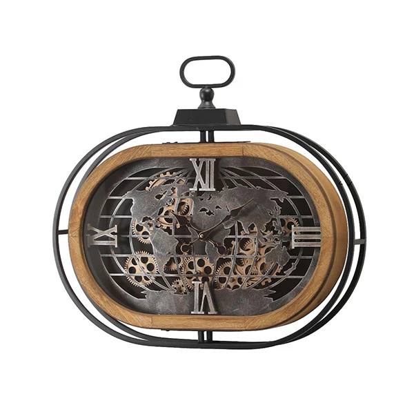 ساعة حائط بتصميم فريد يجمع بين الطابع الصناعي وروح المغامرة. تتميز الساعة بقرص بيضاوي الشكل مزخرف بخريطة العالم المصنوعة من المعدن، مع تروس داخلية مكشوفة تضفي عليها لمسة عتيقة. الأرقام الرومانية الموزعة على حواف القرص الخشبية تكمل مظهرها الكلاسيكي. الإطار الخارجي المعدني الأسود يعطيها مظهرًا أنيقًا ومتينًا، مع حلقة علوية لتعليقها. أبعادها الموضحة في الصورة هي: العرض 65 سم، الارتفاع 60 سم، والعمق 8 سم